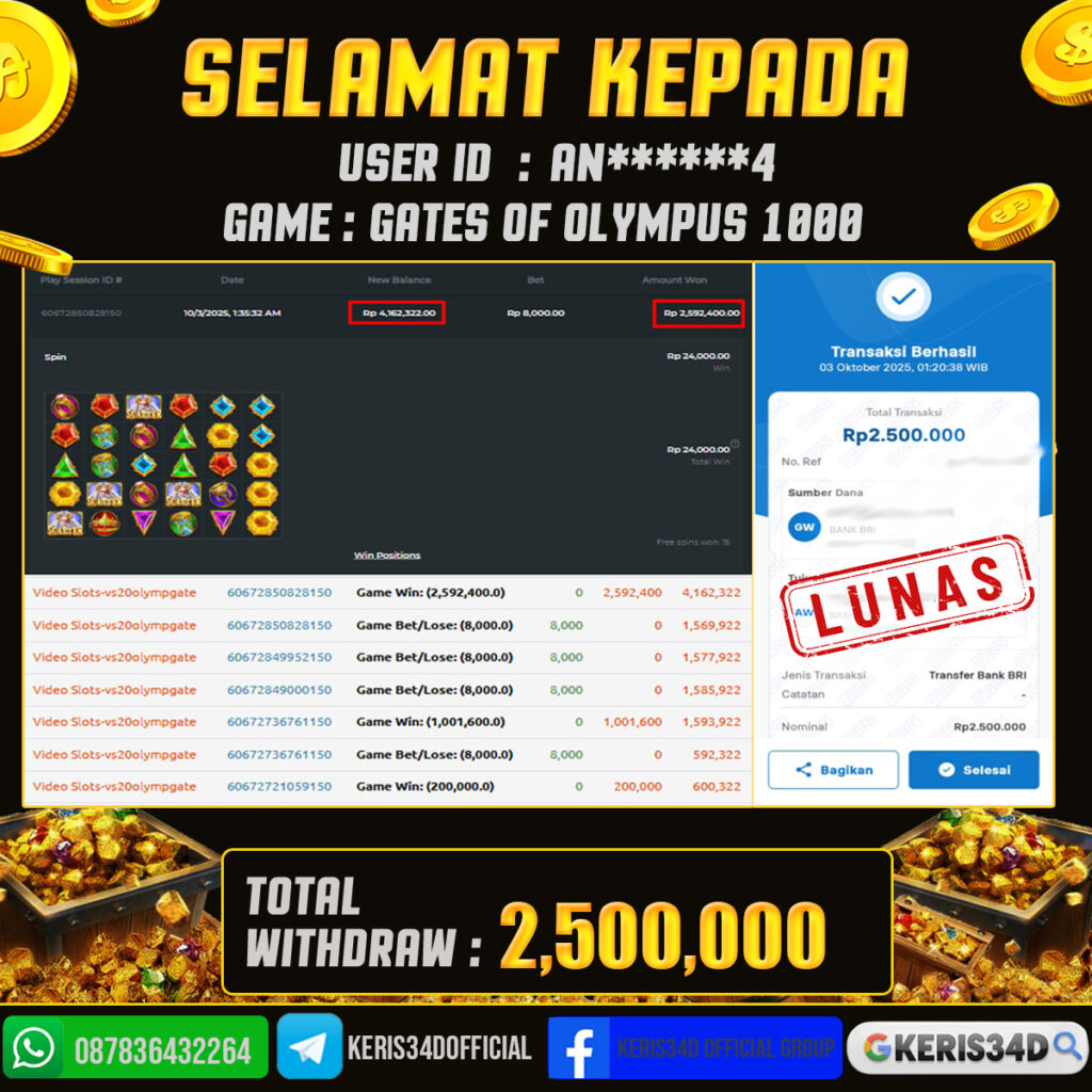 Setiap hari, member KERIS34D berhasil meraih jackpot besar dari berbagai provider slot ternama yang kami sediakan, seperti Pragmatic Play, Habanero, PG Soft, dan masih banyak lagi. Kami secara rutin menampilkan bukti screenshot atau rekapan kemenangan yang berhasil diraih, mulai dari kemenangan ratusan ribu hingga puluhan juta rupiah. Semua slip kemenangan ini kami hadirkan untuk membuktikan bahwa di KERIS34D, peluang menang itu nyata