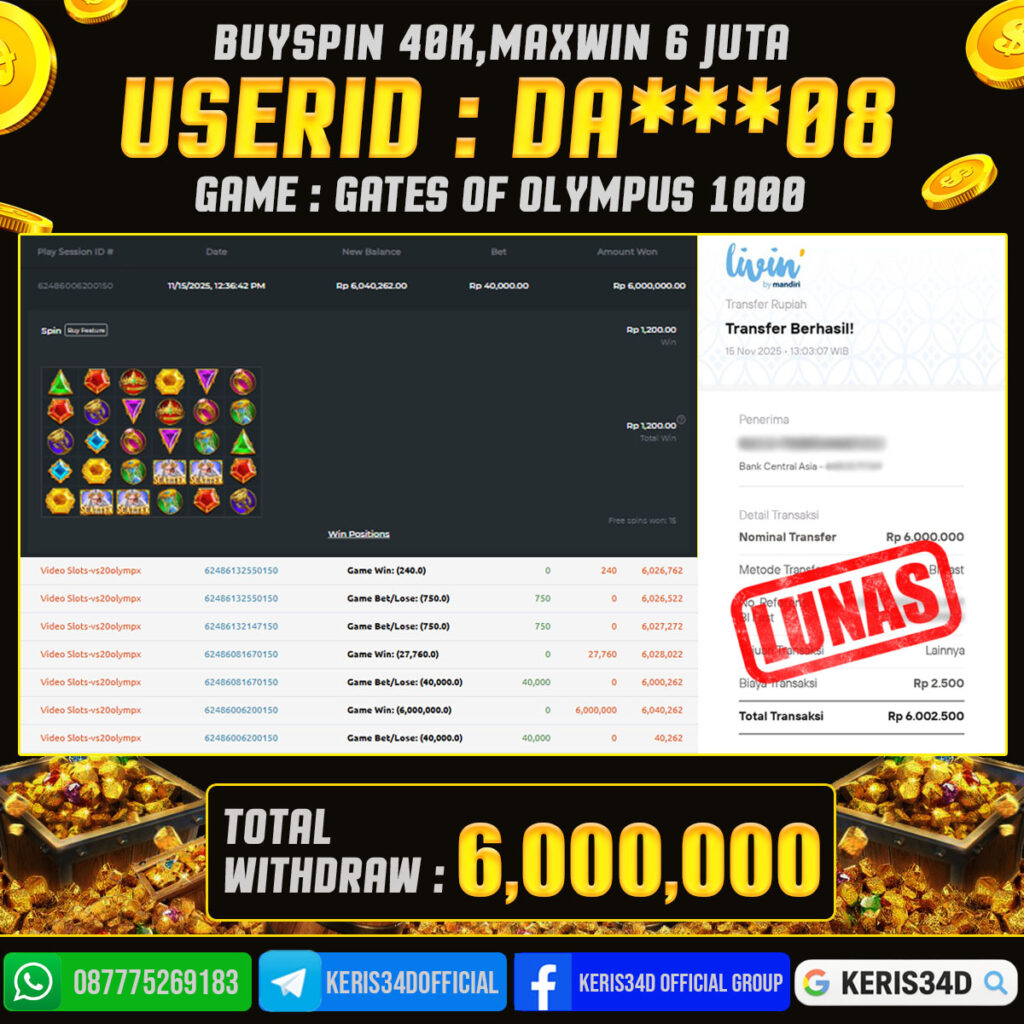 KERIS34D dikenal sebagai situs terpercaya yang selalu menghadirkan pengalaman bermain slot online yang aman, fair, dan berlisensi resmi. Di sini, kami tidak hanya sekadar memberikan janji, tapi bukti nyata berupa slip kemenangan yang dapat Anda lihat secara langsung.