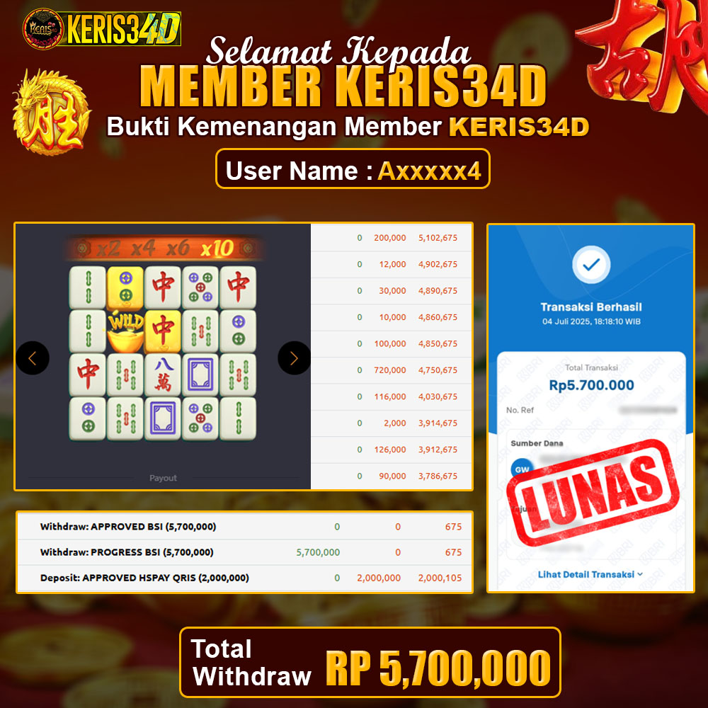 Setiap hari, member KERIS34D berhasil meraih jackpot besar dari berbagai provider slot ternama yang kami sediakan, seperti Pragmatic Play, Habanero, PG Soft, dan masih banyak lagi. Kami secara rutin menampilkan bukti screenshot atau rekapan kemenangan yang berhasil diraih, mulai dari kemenangan ratusan ribu hingga puluhan juta rupiah. Semua slip kemenangan ini kami hadirkan untuk membuktikan bahwa di KERIS34D, peluang menang itu nyata