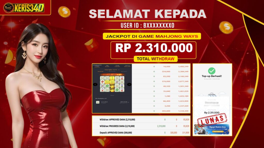 Setiap hari, member KERIS34D berhasil meraih jackpot besar dari berbagai provider slot ternama yang kami sediakan, seperti Pragmatic Play, Habanero, PG Soft, dan masih banyak lagi. Kami secara rutin menampilkan bukti screenshot atau rekapan kemenangan yang berhasil diraih, mulai dari kemenangan ratusan ribu hingga puluhan juta rupiah. Semua slip kemenangan ini kami hadirkan untuk membuktikan bahwa di KERIS34D, peluang menang itu nyata