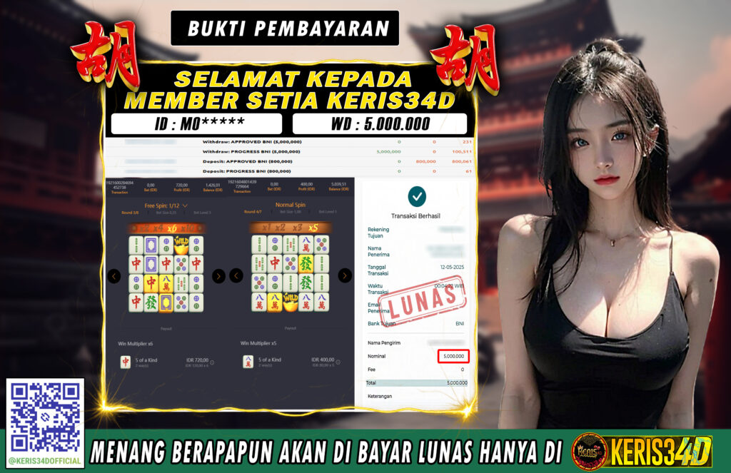 KERIS34D dikenal sebagai situs terpercaya yang selalu menghadirkan pengalaman bermain slot online yang aman, fair, dan berlisensi resmi. Di sini, kami tidak hanya sekadar memberikan janji, tapi bukti nyata berupa slip kemenangan yang dapat Anda lihat secara langsung.