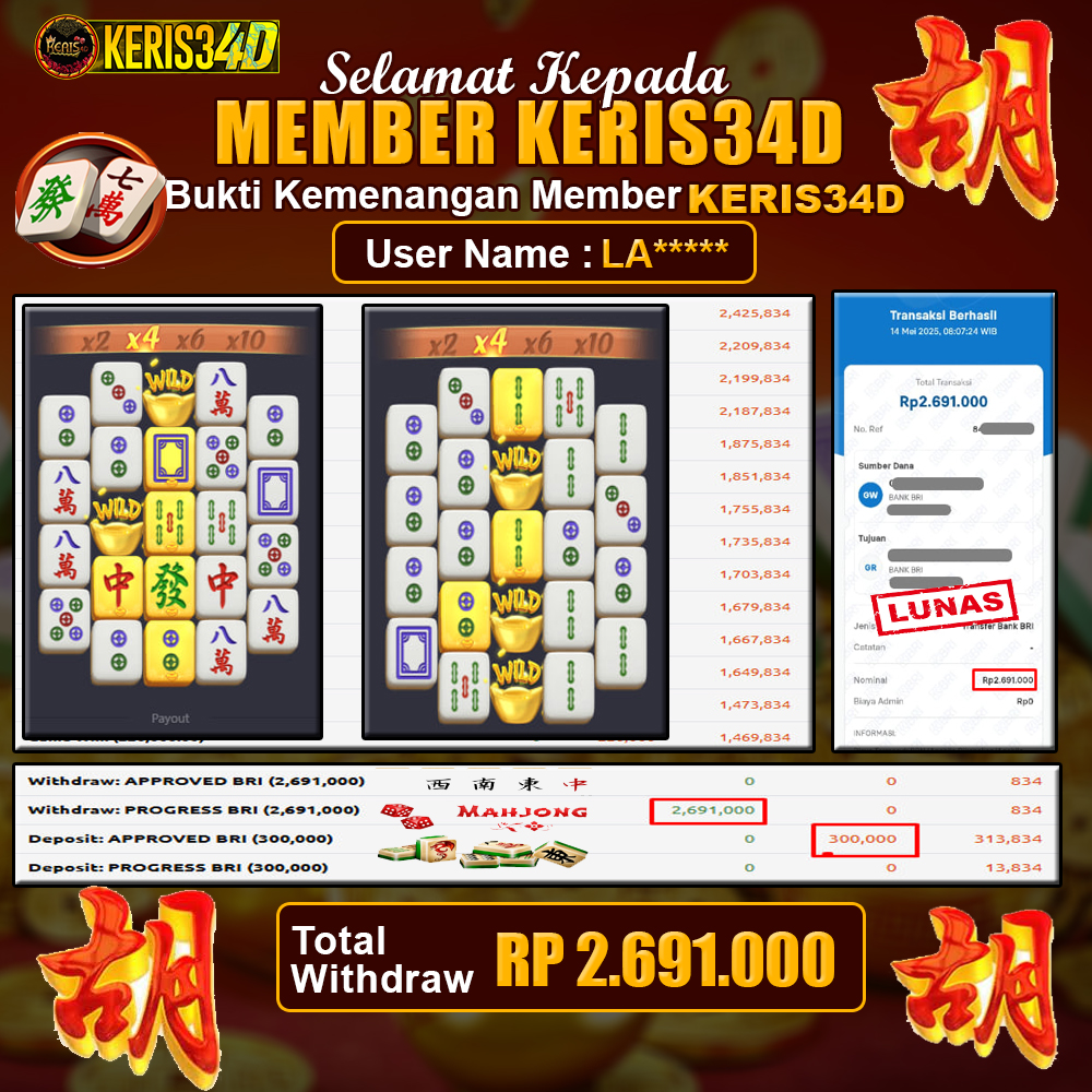 Setiap hari, member KERIS34D berhasil meraih jackpot besar dari berbagai provider slot ternama yang kami sediakan, seperti Pragmatic Play, Habanero, PG Soft, dan masih banyak lagi. Kami secara rutin menampilkan bukti screenshot atau rekapan kemenangan yang b