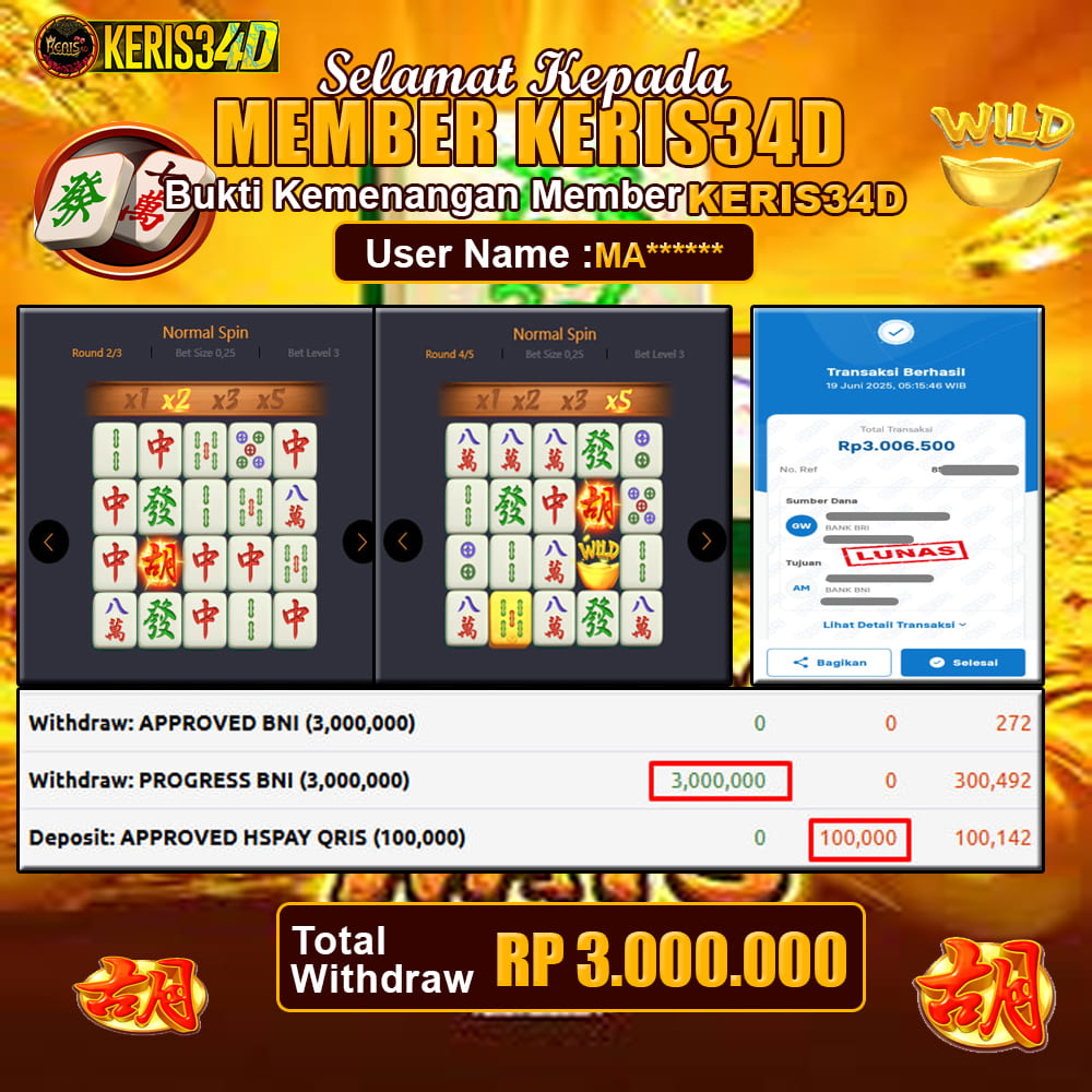 Setiap hari, member KERIS34D berhasil meraih jackpot besar dari berbagai provider slot ternama yang kami sediakan, seperti Pragmatic Play, Habanero, PG Soft, dan masih banyak lagi. Kami secara rutin menampilkan bukti screenshot atau rekapan kemenangan yang berhasil diraih, mulai dari kemenangan ratusan ribu hingga puluhan juta rupiah. Semua slip kemenangan ini kami hadirkan untuk membuktikan bahwa di KERIS34D, peluang menang itu nyata