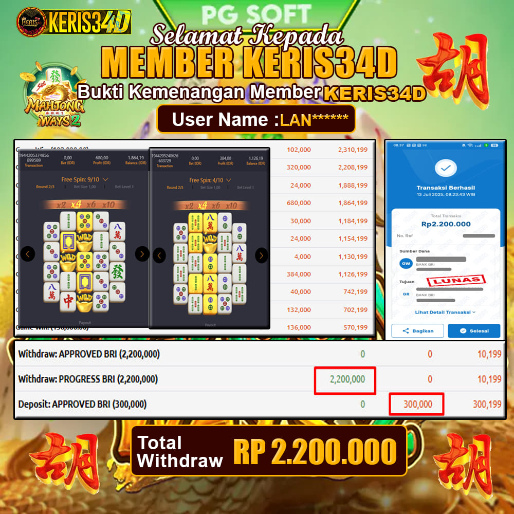 Setiap hari, member KERIS34D berhasil meraih jackpot besar dari berbagai provider slot ternama yang kami sediakan, seperti Pragmatic Play, Habanero, PG Soft, dan masih banyak lagi. Kami secara rutin menampilkan bukti screenshot atau rekapan kemenangan yang berhasil diraih, mulai dari kemenangan ratusan ribu hingga puluhan juta rupiah. Semua slip kemenangan ini kami hadirkan untuk membuktikan bahwa di KERIS34D, peluang menang itu nyata