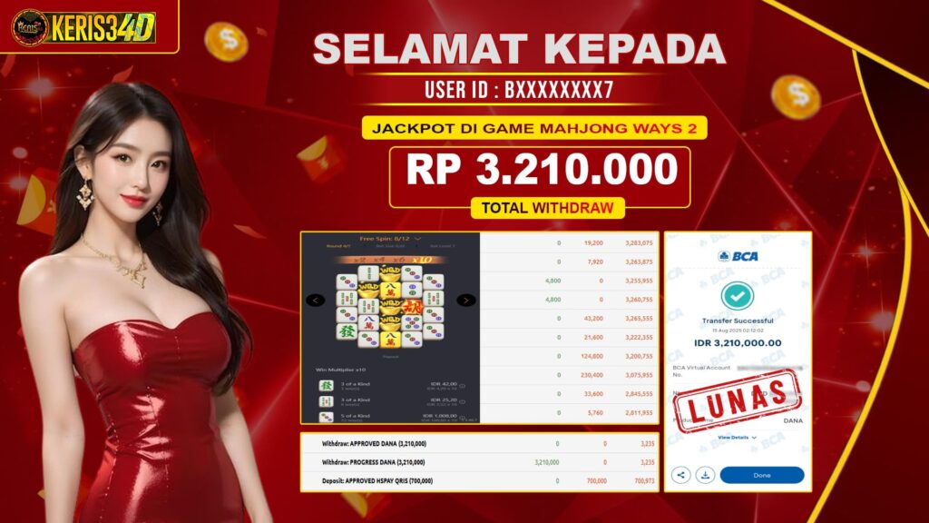 Setiap hari, member KERIS34D berhasil meraih jackpot besar dari berbagai provider slot ternama yang kami sediakan, seperti Pragmatic Play, Habanero, PG Soft, dan masih banyak lagi. Kami secara rutin menampilkan bukti screenshot atau rekapan kemenangan yang berhasil diraih, mulai dari kemenangan ratusan ribu hingga puluhan juta rupiah. Semua slip kemenangan ini kami hadirkan untuk membuktikan bahwa di KERIS34D, peluang menang itu nyata
