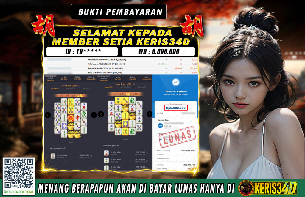 Setiap hari, member KERIS34D berhasil meraih jackpot besar dari berbagai provider slot ternama yang kami sediakan, seperti Pragmatic Play, Habanero, PG Soft, dan masih banyak lagi. Kami secara rutin menampilkan bukti screenshot atau rekapan kemenangan yang berhasil diraih, mulai dari kemenangan ratusan ribu hingga puluhan juta rupiah. Semua slip kemenangan ini kami hadirkan untuk membuktikan bahwa di KERIS34D, peluang menang itu nyata